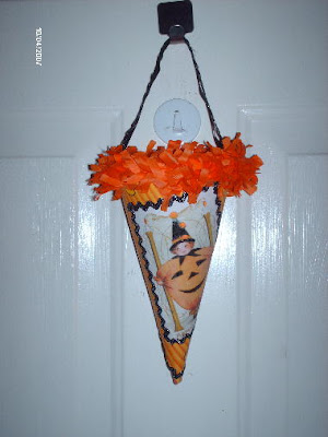 I made this one Sunday. The spiderweb paper had printed images of spiderwebs, so I added silver glitter here and there to make it "pop". I outlined the image with black glitter and topped it off with some fluffy black trim that I found at Hobby Lobby. (I loves my Hobby Lobby!). I added the silver bauble at the bottom at the last minute and liked the way this one turned out. The vintage lace was white and didn't look quite right, so I threw it in the coffee pot and let it soak in the leftover coffee. The bean thought I had lost it at that point.